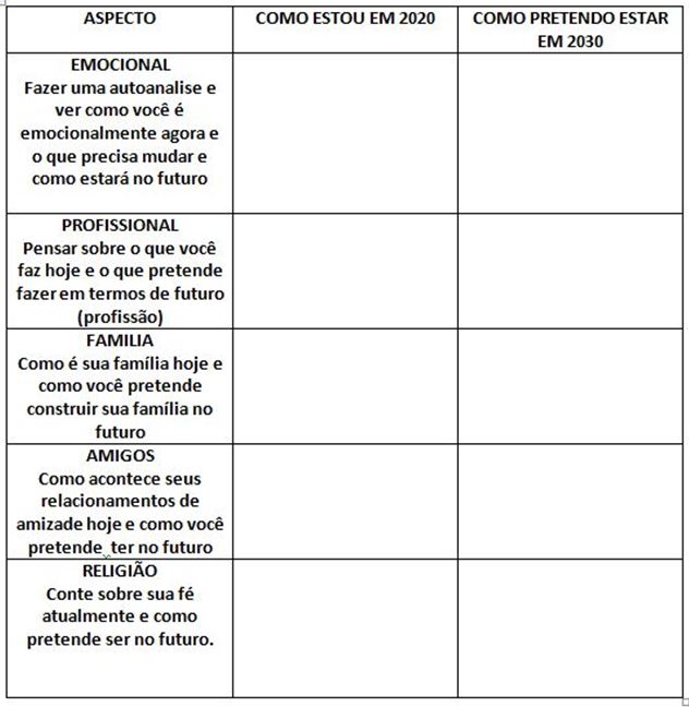 Vamos agora refletir sobre sua vida. Para isso, vamos fazer uma projeção de sua vida daqui a 10 anos, Assim, preencha a tabela abaixo.